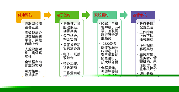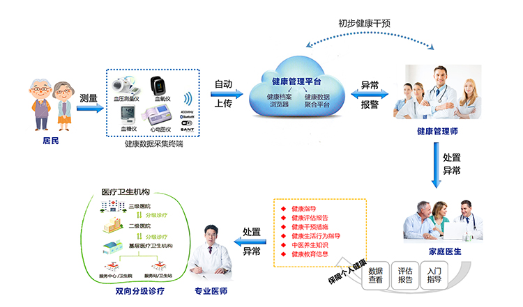 家庭醫生簽約平臺是實施家庭健康管理的服務平臺,它在社區范圍內,以家庭為單位,由社區衛生服務中心和區域醫療衛生協同服務體系提供支撐,建立居民健康檔案為分級診療制度建設逐步形成基層首診、雙向轉診、急慢分治、上下聯動的分級診療和就醫真正政 策落地模式,全方位的生命體征采集和檢測,線上線下的數據干預,為家庭成員提供綜合、連續、有效的基本衛生服務。
