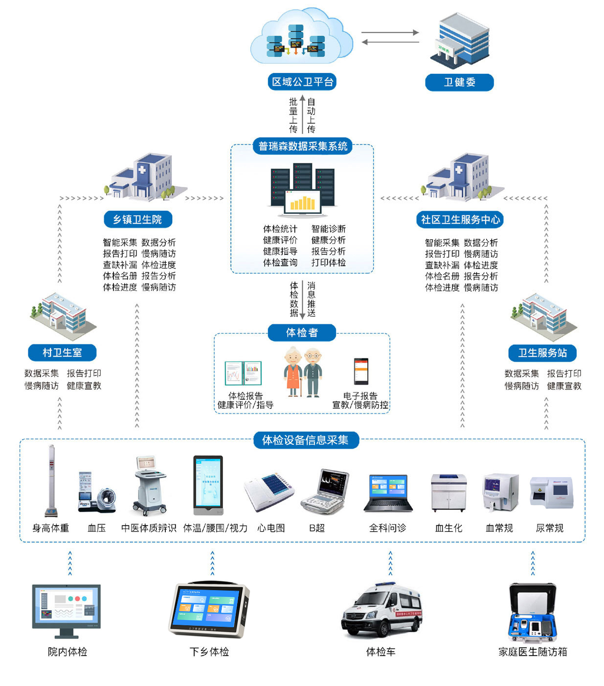 普瑞森公衛數據智能采集系統一一縣鄉村一體化方案以滿足公衛考核為基本要求,充分緩解基層公衛人員入手少,任務重的問題,充分調動鄉鎮衛圭院和村衛生室的積極作用,通過智能建擋和高效體檢以及健康數據實時傳輸等業務,為全域居民建立“以健康為中心、以數據為依托”的健康服務體系,利用物聯網+智能信息化應用,建設統一、規范、標準的慢病管理中心,提升基層醫生對慢病患者的服務質量和管理水平。